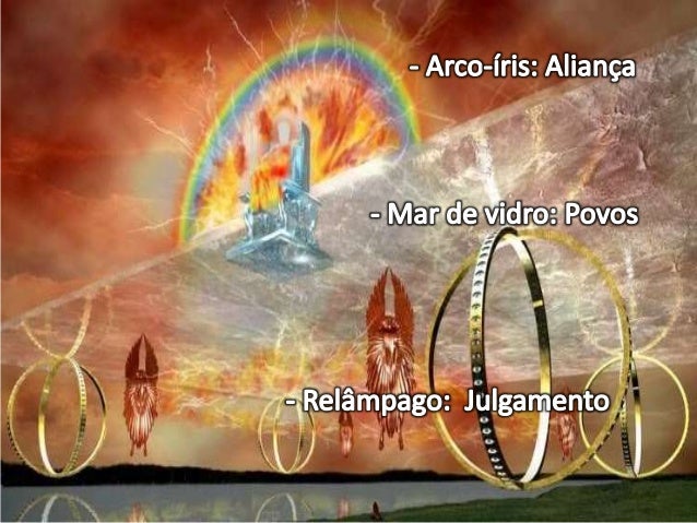 - 7. Quais são as características do Trono de Deus - v. 3-7 A. O Trono de Deus é um trono de Graça e Misericórdia - v.3 Ao redor do trono há um arco-íris semelhante, no aspecto, a esmeralda. O arco-íris é o símbolo da Graça e Misericórdia de Deus, da sua aliança com o seu povo, de que não mais o destruiria. Normalmente o arco-íris aparece depois da tempestade, mas aqui, ele aparece antes dela. B. O Trono de Deus é um trono de Juízo — v. 5 > Os relâmpagos, as vozes e os trovões são evidências de juízo e ira. O arco-íris foi visto antes dos relâmpagos. A graça sempre antecede ao julgamento. Aqueles que recusaram a misericórdia terão que suportar o juízo. Quem não foi purificado pelo sangue, terá que suportar o fogo do juízo divino. > O Espírito de Deus aqui não se manifesta como pomba, mas como sete tochas de fogo (símbolo de combate - Gideão). C. O Trono de Deus é um trono de santidade e transparência - v.6 > Esse mar de vidro está em contraste com o mar de sujeira e poluição do pecado (Is 57:20). Para estar diante do trono de Deus é preciso ser purificado, estar limpo. Não há sujeira diante do trono de Deus. Não há corrupção. Tudo é transparente, limpo, puro. Deus é santo. No céu não entra nada contaminado. Deus não se associa com o mal. Ele abomina o mal. Embora ele ame a todos, ele não ama a tudo.